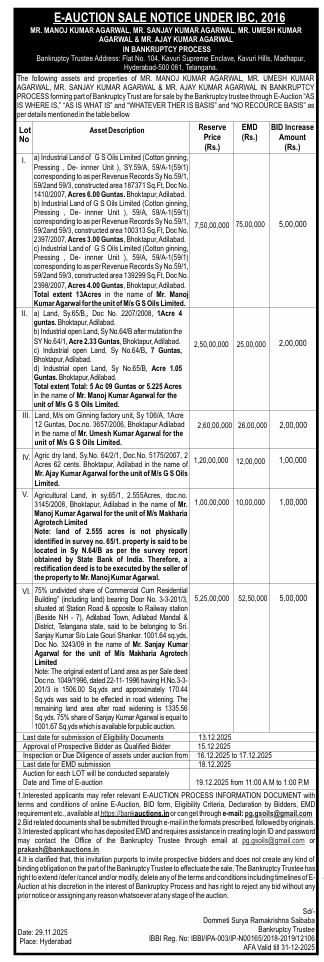 | Schedule of Property: | II) a) Land, Sy.65/B,, Doc No. 2207/2008, 1Acre 4 guntas. Bhoktapur, Adilabad.b) Industrial open Land, Sy No.64/B after mutation the SY No.64/1, Acre 2.33 Guntas,Bhoktapur, Adilabad.c) Industrial open Land, Sy No.64/B, 7 Guntas, Bhoktapur, Adilabad. d) Industrial open Land, Sy No.65/B, Acre 1.05 Guntas. Bhoktapur, Adilabad. Total extent Total: 5 Ac 09 Guntas or 5.225 Acres in the name of Mr. Manoj Kumar Agarwal for the unit of M/s G S Oils Limited.d) Industrial open Land, Sy No.65/B, Acre 1.05 Guntas. Bhoktapur, Adilabad |