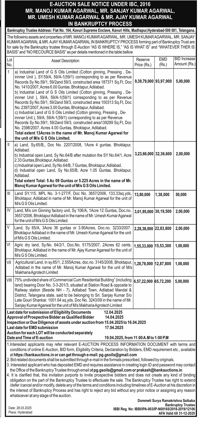 | Schedule of Property: | a) Industrial Land of GS Oils Limited (Cotton ginning, Pressing De-innner Unit ), SY.59/A, 59/A-1(59/1) corresponding to as per Revenue Records Sy No.59/1, 59/2and 59/3, constructed area 187371 Sq.Ft, Doc No 1410/2007, Acres 6.00 Guntas. Bhoktapur, Adilabad.b) Industrial Land of G S Oils Limited (Cotton ginning, Pressing De- innner Unit ), 59/A, 59/A-1(59/1) corresponding to as per Revenue Records Sy No.59/1, 59/2and 59/3, constructed area 100313 Sq.Ft, Doc No. 2397/2007, Acres 3.00 Guntas, Bhoktapur, Adilabad.c) Industrial Land of GS Oils Limited (Cotton ginning, Pressing De-innner Unit 59/A, 59/A-1(59/1) corresponding to as per Revenue Records Sy No.59/1, 59/2and 59/3, constructed area139299 Sq.Ft, Doc No. 2398/2007, Acres 4.00 Guntas, Bhoktapur, Adilabad.Total extent 13Acres in the name of Mr. Manoj Kumar Agarwal for the unit of M/s G S Oils Limited. |