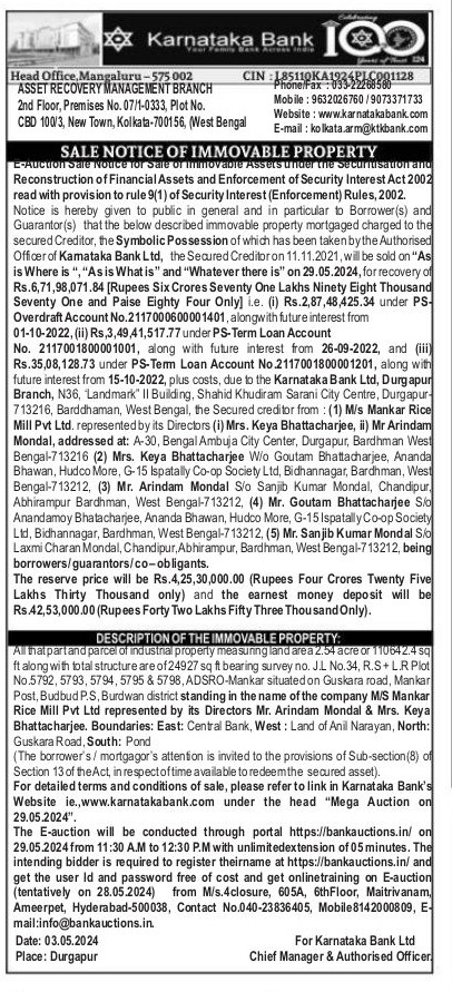 | Schedule of Property: | All that part and parcel of industrial property measuring land area acre or 110642.4 sq ft along with total structure are of 24927 sq ft bearing survey no. J.L No.34 R.S+ LR Plot No 5792, 5793. 5794, 5795 & 5798. ADSRO-Mankar situated on Guskara road, Mankar Post, Budbud P.S. Burdwan district standing in the name of the company M/S Mankar Rice Mill Pvt Ltd represented by its Directors Mr. Arindam Mondal & Mrs. Keya Bhattacharjee. Boundaries: East: Central Bank, West Land of Anil Narayan, North: Guskara Road, South: Pond |