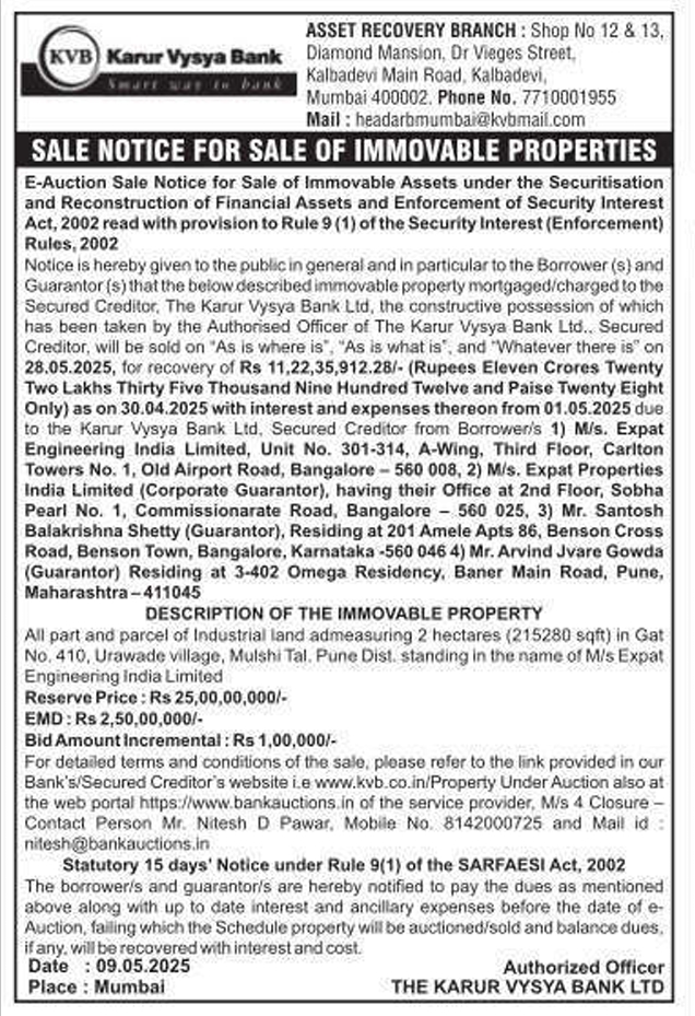 | Contact Details: | Contact The Authorized Officer: 1. Mr. Haridas T Phone: 7710001955 Email: headarbmumbai@kvbmail.com 2. Mr. Pankaj R Wankhade, Phone: 9512366677 Email: pankajrw@kvbmail.com |