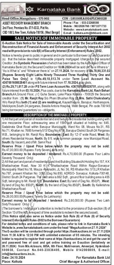 | End Date and Time of Auction: | 27-11-2024 12:30 pm |