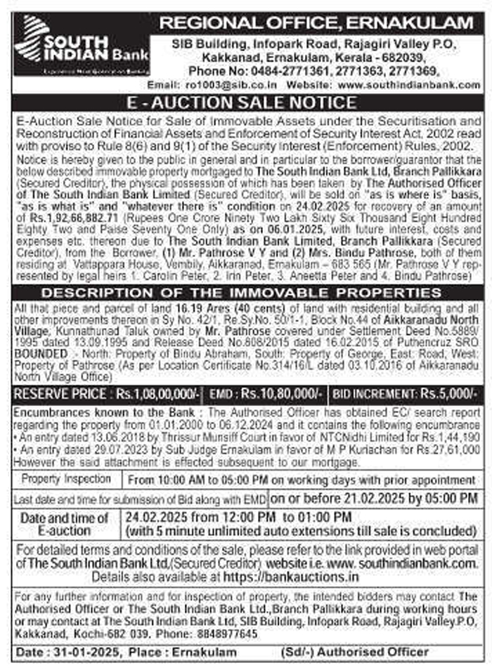 | Schedule of Property: | All that piece and parcel of land 16.19 Ares (40 cents) of land with residential building and all other improvements thereon in Sy No. 42/1, Re.Sy.No. 50/1-1, Block No.44 of Aikkaranadu North Village, Kunnathunad Taluk owned by Mr. Pathrose covered under Settlement Deed No.5889/1995 dated 13.09.1995 and Release Deed No.808/2015 dated 16.02.2015, of Puthencruz SRO BOUNDED North: Property of Bindu Abraham, South: Property of George, East Road, West: Property of Pathrose (As per Location Certificate No.314/16/L dated 03.10.2016 of Aikkaranadu North Village Office) |