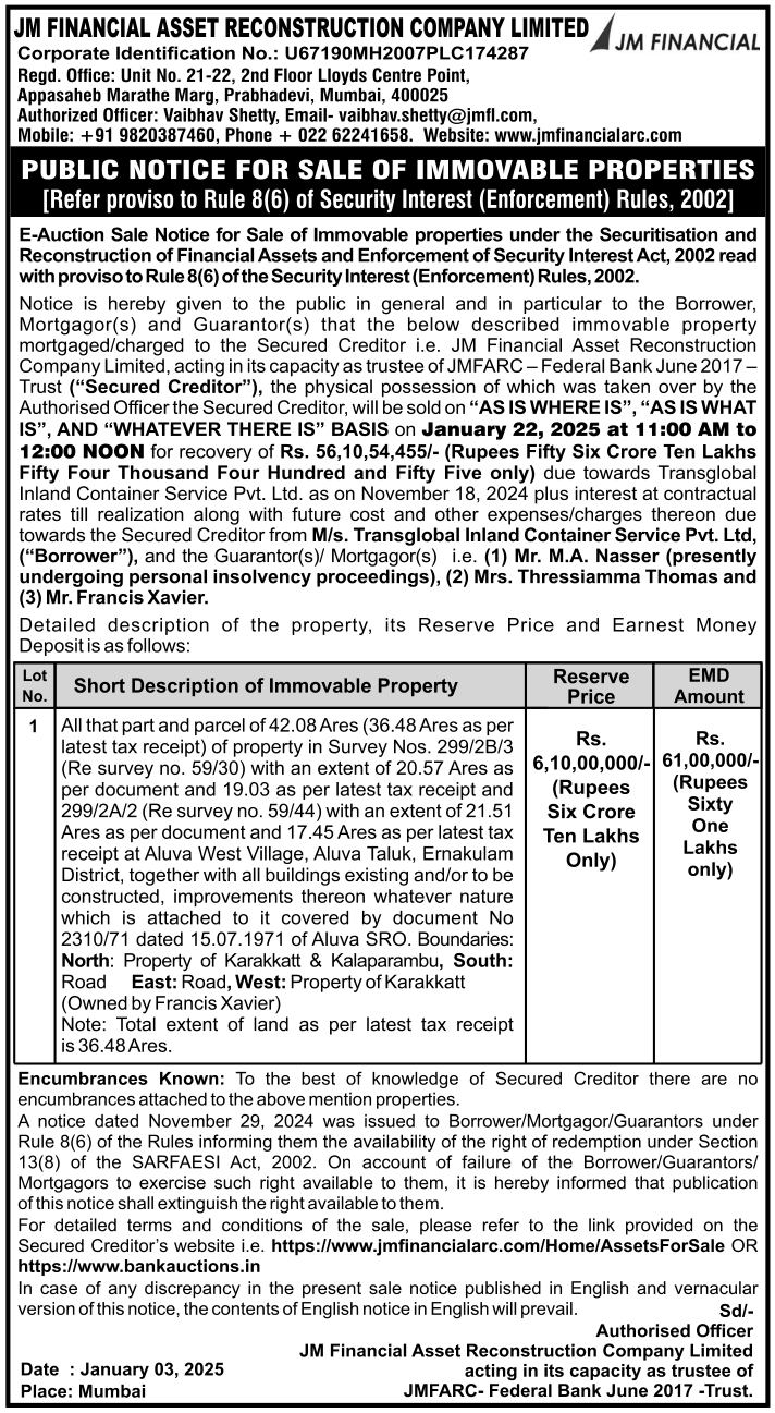 | Contact Details: | Contact The Authorized Officer : Vaibhav Shetty, Email- vaibhav.shetty@jmfl.com, Mobile: +91 9820387460, Phone + 022 62241658. |