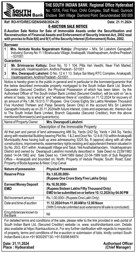 | Schedule of Property: | All that part and parcel of land admeasuring 486 Sq. Yards (242 Sq. Yards 244 Sq. Yards) along with residential Building bearing Plot No. 1 & 2 and Door No. 12-4-8 (10) within Anakapalli Municipality Area having built up area admeasuring 3225 Sq. ft (approx) along with all other constructions, improvements, easementary rights existing and appurtenant thereon situated in Sy No. 20/2, 43/1 within Anakapalli Village and Taluk, Yeti Avathalakhandam, Visakhapatnam District and owned by Dwarapudi Lakshmi morefully described in Sale Deed no 2239/1982 dated 14-04-1982 and Sale Deed no. 1344/1989 dated 22-04-1989 both of Sub Registrar Office Anakapalli and bounded on; North: Property of Vedula People South Road; East: Property of Boda Apparao & West: Crop Canal |