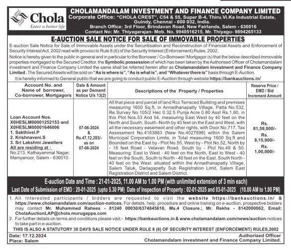 | Contact Details: | Contact The Authorized Officer: Mr. Thiyagarajan - 9940516215, Mr. Thiyagu- 9894265133, Mr. Muhammed Rahees - 8124000030 |