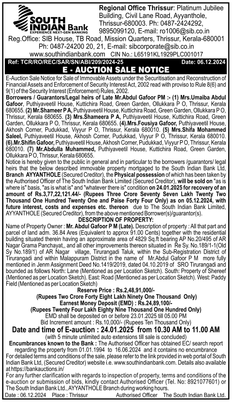 | Schedule of Property: | Description of property: All that part and parcel of land adm. 36.84 Ares (Equivalent to approx 91.00 Cents) together with the residential building situated therein having an approximate area of 4829 Sq.ft bearing AP No.20/495 of AR Nagar Grama Panchayat,, and all other improvements thereon situated in Re Sy. No.189/1-1(Old Sy No.189/1) of AR Nagar village, Tirurangadi Taluk, within the Sub-Registration District of Tirurangadi and within Malappuram District in the name of Mr.Abdul Gafoor PM more fully mentioned in Jenm Assignment Deed No.1419/2019, dated 04.10.2019 of SRO Tirurangadi and bounded as follows North: Lane (Mentioned as per Location Sketch). South: Property of Shereef (Mentioned as per Location Sketch). East: Road (Mentioned as per Location Sketch). West: Paddy Field (Mentioned as per Location Sketch) |
