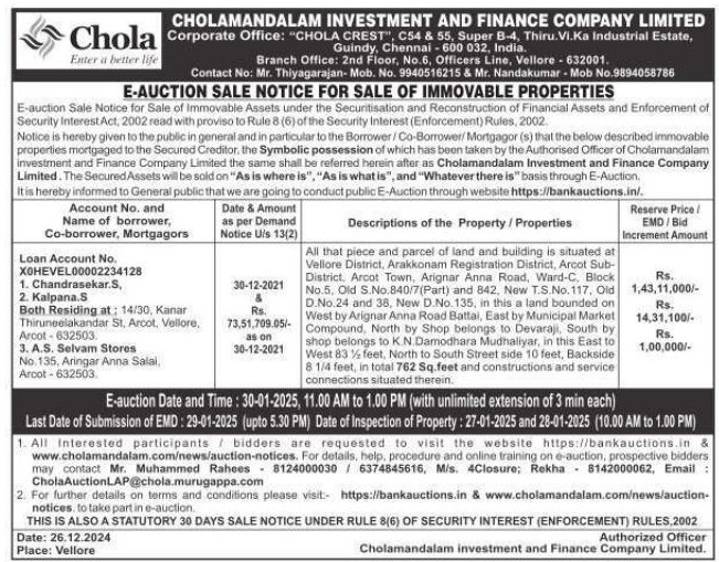 | Contact Details: | Contact the Authorized Officer : Mr. Muhammed Rahees - 8124000030 / 6374845616, Mr. Thiyagarajan- Mob. No. 9940516215 & Mr. Nandakumar - Mob No.9894058786. |