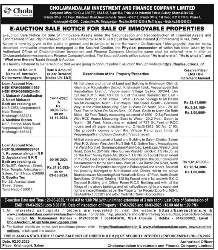 | Contact Details: | Contact The Authorized Officer: Mr. Thiyagarajan: 9940516215 & Thiyagu :9894265133, Mr. Muhammed Rahees - 8124000030 / 6374845616 |