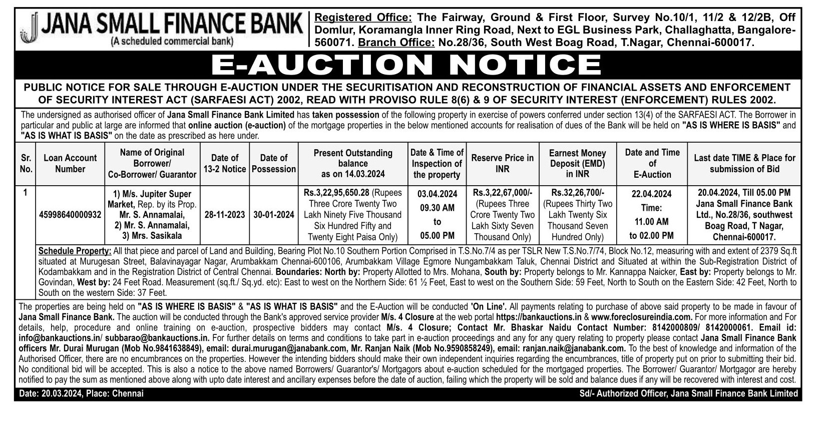 | Contact Details: | Contact The Authorized Officer: Mr. Durai Murugan (Mob No.9841638849), email: durai.murugan@janabank.com, Mr. Ranjan Naik (Mob No.9590858249), email: ranjan.naik@janabank.com. |