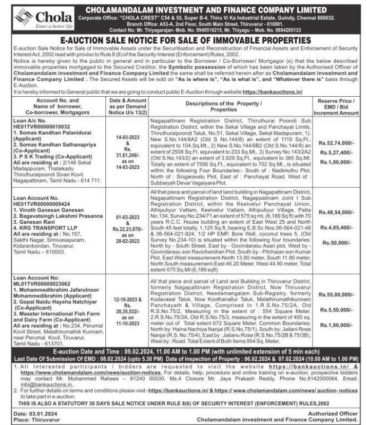 | Contact Details: | Contact The Authorized Officer : Mr. Thiyagarajan 9940516215, and Mr.Muhammed Rahees-8142000030 |