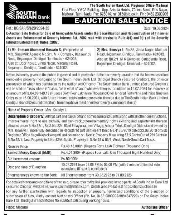 | Contact Details: | Contact The Authorized Officer Phno : 0452-2300205/ 9894647220 / 8056531536 |