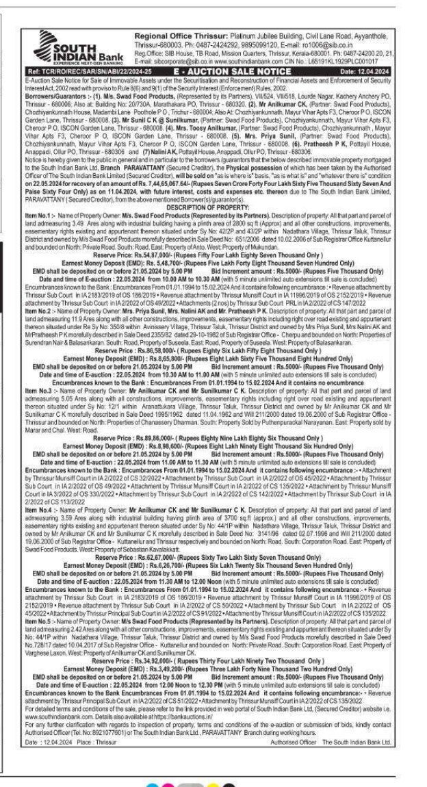 | Schedule of Property: | All that part and parcel of land admeasuring 11.9 Ares along with all other constructions, improvements, easementary rights including right over road existing and appurtenant thereon situated under Re Sy No: 350/8 within Avinissery Village, Thrissur Taluk, Thrissur District and owned by Mrs Priya Sunil, Mrs Nalini AK and MrPratheesh PK morefully described in Sale Deed 2355/82 dated 29-10-1982 of Sub Registrar Office-Cherpu and bounded on North: Properties of Surendran Nair & Balasankaran South Road, Property of Suseela. East Road, Property of Suseela. West: Property of Balasankaran. |
