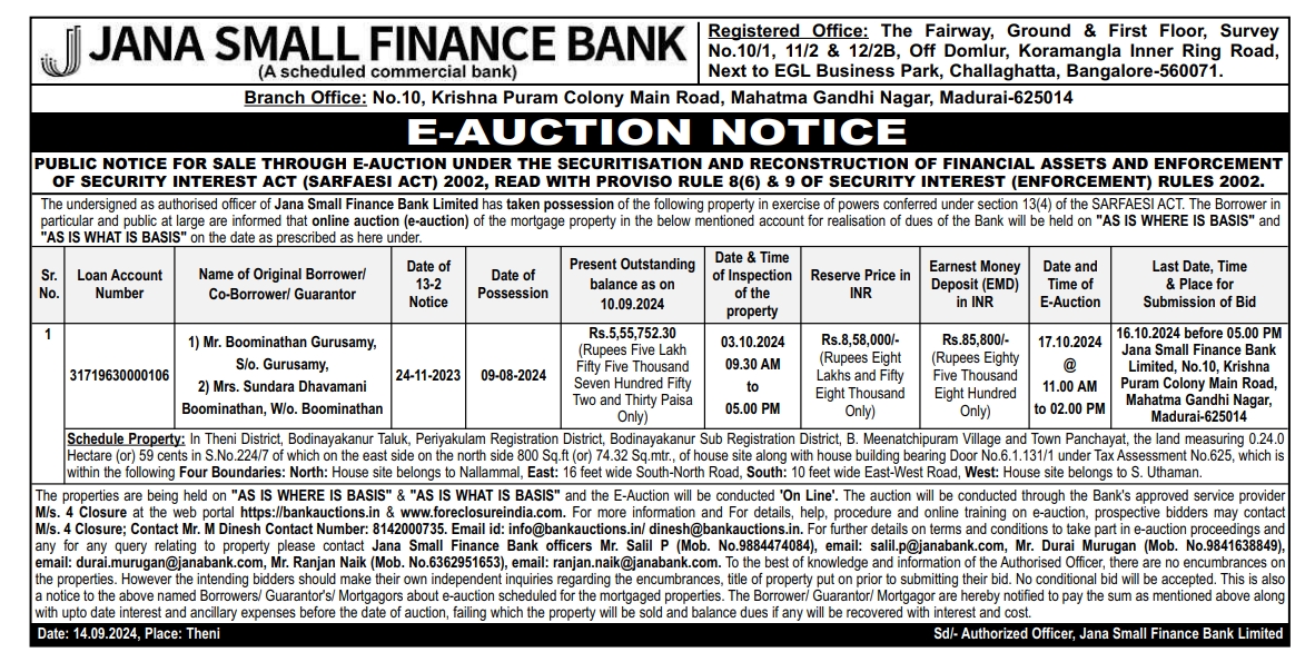 | Contact Details: | Contact The Authorized Officer : Mr.Durai Murugan -9841638849/ Mr.Ranjan Naik : 6362951653 Email Id : durai.murugan@janabank.com Email: ranjan.naik@janabank.com. |