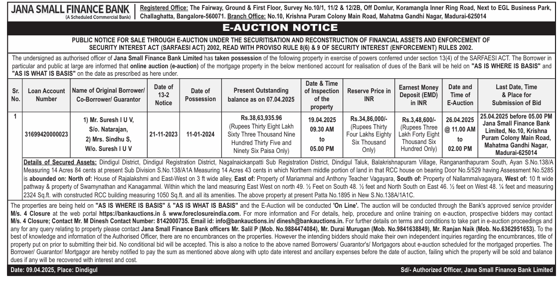 | Contact Details: | Contact The Authorized Officer : Mr. Salil P (Mob. No.9884474084), Mr. Durai Murugan (Mob. No.9841638849), Mr. Ranjan Naik (Mob. No.6362951653). |
