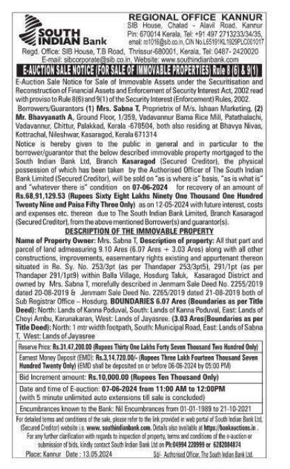 | Schedule of Property: | Name of Property Owner: Mrs Sabna T. Description of property: All that part and parcel of land admeasuring 9.10 Ares (6.07Ares+3.03Ares) along with all other constructions, improvements, easmentary rights existing and appurtenant thereon situated in Re Sy No.253/3pt (as per Thandaper 253/3pt5), 291/1 pt (as per Thandaper 291/1pt9) within Balla Village, Hosdurg Taluk, Kasaragod District and owned by Mrs.Sabna T, morefully described in Jenmam Sale Deed no 2255/2019 dated 20-08- 2019 & Jenmam Sale deed no 2265/2019 dated 21-08-2019 both of Sub Registrar Office-Hosdurg BOUNDARIES 6.07 Ares (as per Title Deed): North:Lands of Kanna Poduval, South: Lands of Kanna Poduval, East: Lands of Choyi Ambu, Karunakaran, West: Lands of Jayasree. 3.03 Ares (as per Title Deed): North:1 mtr width footpath, South: Municipal Road, East: Lands of Sabna T. West: Lands of Jayasree. |