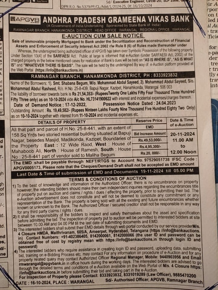 | Schedule of Property: | All that part and parcel of H.No. 25-8-441, with an extent of 158 Sq Yrds two storied resiential building situated at Bapuji Nagar, besedes Masjid, Madikonda, Kazipet, Boundaries of the Property East : 12 Wide Raod, West : House of of Ramesh, South : House Mahaboob Ali, North : House No : 25-8-441 part of vendor sold to Maliha Begum |