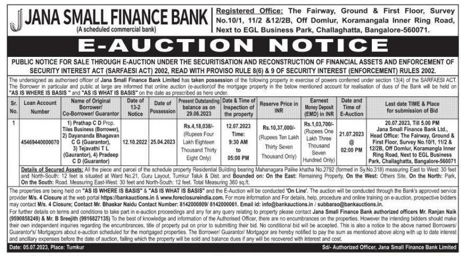 | Start Date and Time of Auction: | 21-07-2023 2:00 pm |