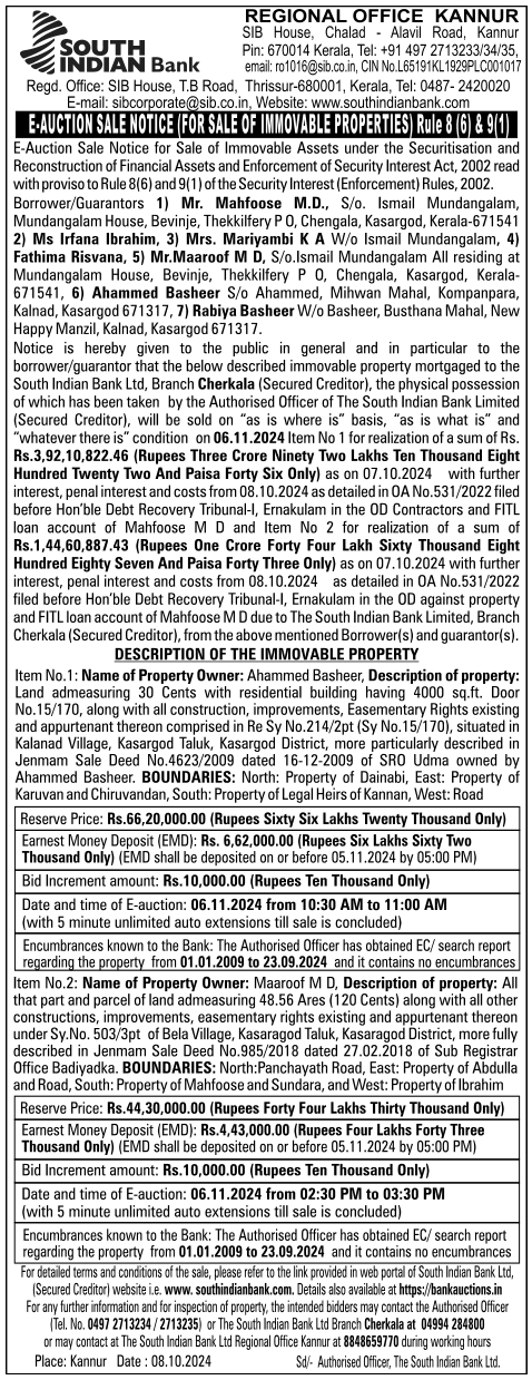 | Contact Details: | Contact The Authorized Officer: Tel. No. 0497-2713234/2713235, 04994 284800, 8848659770 |