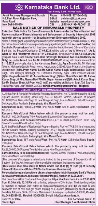 | Schedule of Property: | 2. All that Part & Parcel of Residential Property Bearing Plot No 77A 78, land measuring 167.66 Square meters. Building Measuring 144.37 Square Meters, situated at Khasra No. 1292/81mi, Baikunthi Bagh III. near Bhagwati Bagh, Mauza Naraich Tehsil Etmadpur, Dist: Agra, Uttar Pradesh Belonging to Mrs. Munni Devi Boundaries: East 15'ft wide Rasta West Plot No. 79 North 25'f wide Rasta South Plot No. 32 |