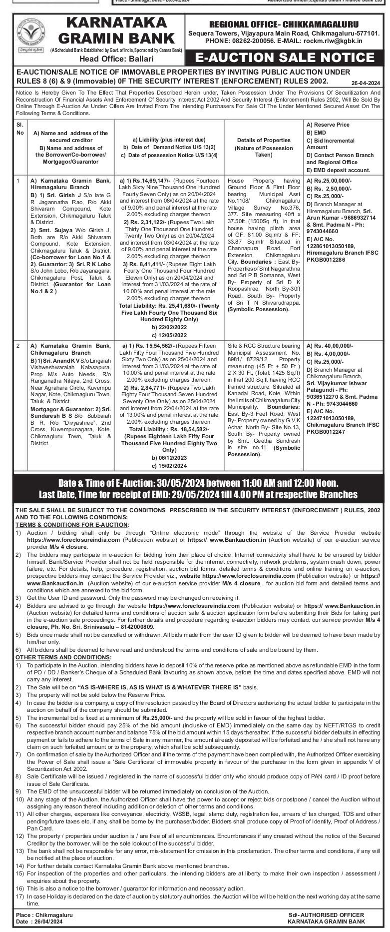 | Contact Details: | Contact the Authorized Officer : Branch Manager, Sri. Arun Kumar - 9686932714 & Smt. Padma N - Ph: 9743044660. |