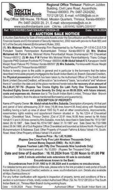 | Contact Details: | Contact The Authorized officer: 0487-2424292, 7012128120 E-mail: ro1006@sib.co.in Ph: 0487-24200 20. 21. E-mail: sibcorporate@sib.co.in www.southindianbank.com |