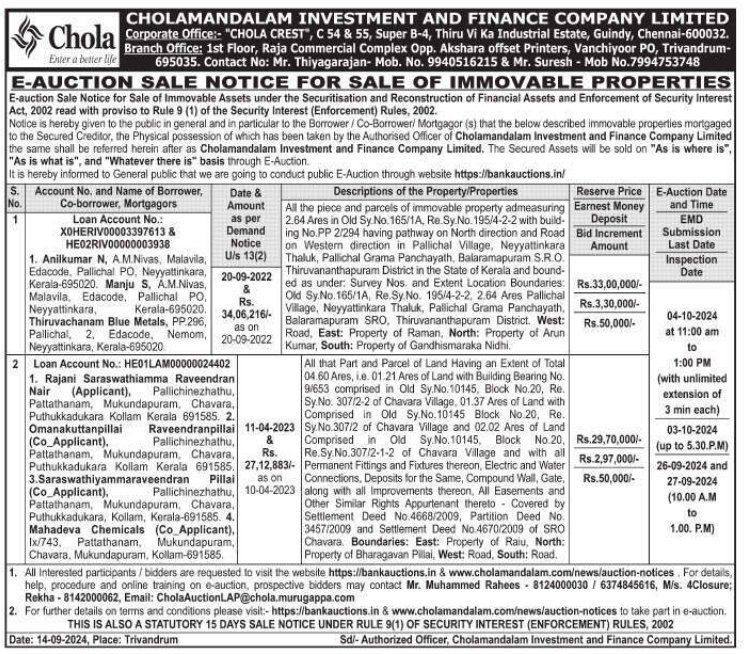 | Contact Details: | Contact The Authorized Officer : Mr. Thiyagarajan- Mob. No. 9940516215& Mr. Muhammed Rahees Ph No: 8124000030 |