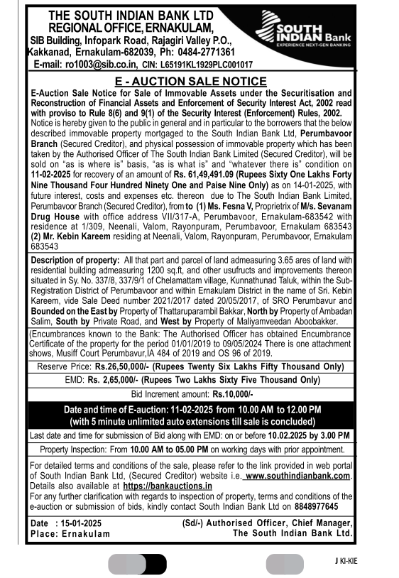 | Schedule of Property: | Description of property: All that part and parcel of land admeasuring 3.65 ares of land withresidential building admeasuring 1200 sq.ft, and other usufructs and improvements thereon situated in Sy. No. 337/8, 337/9/1 of Chelamattam village, Kunnathunad Taluk, within the Sub- Registration District of Perumbavoor and within Ernakulam District in the name of Sri. Kebin Kareem, vide Sale Deed number 2021/2017 dated 20/05/2017, of SRO Perumbavur and Bounded on the East by Property of Thattaruparambil Bakkar, North by Property of Ambadan Salim, South by Private Road, and West by Property of Maliyamveedan Aboobakker |