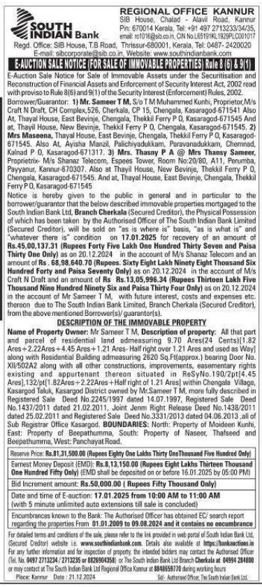 | Inspection Details: | Property Inspection Contact the Authorized Officer : 0497-2713234 / 2713235 or 8826904358, Branch Cherkala at 04994-284800 or Regional Office, Kannur at 8848659770. |