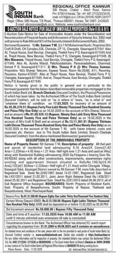 | Schedule of Property: | Name of Property Owner: Mr Sameer TM, Description of property: All that part and parcel of residential land admeasuring 9.70 Ares(24 Cents)[1.82 Ares 2.22Ares 4.45Ares 1.21Ares-Half right over 1.21 Ares and used as Way] along with Residential Building admeasuring 2620 Sq Ft(approx.) bearing Door No. XII/502A2 along with all other constructions, improvements, easementary rights existing and appurtenant thereon situated in ReSyNo.190/2pt[4.45 Ares],132/pt(1.82Ares+2.22Ares Half right of 1.21 Ares) within Chengala Village, Kasargod Taluk, Kasargod District owned by Mr. Sameer TM, more fully described in Registered Sale Deed No.2245/1997 dated 14.07.1997, Registered Sale Deed lo.1437/2011 dated 21.02.2011 Joint Jenm Right Release Deed No.1438/2011 lo.1437/2011 dated 21.02.2011 Joint Jenm Right Release Deed No.1438/2011 dated 25.02.2011 and Registered Sale Deed No.3331/2013 dated 04.06.2013 all of Sub Registrar Office Kasargod BOUNDARIES: North: Property of Moideen Kunhi, East: Property of Beepathumma, South: Property of Naseer, Thafseed and Beepathumma, West: Panchayat Road |