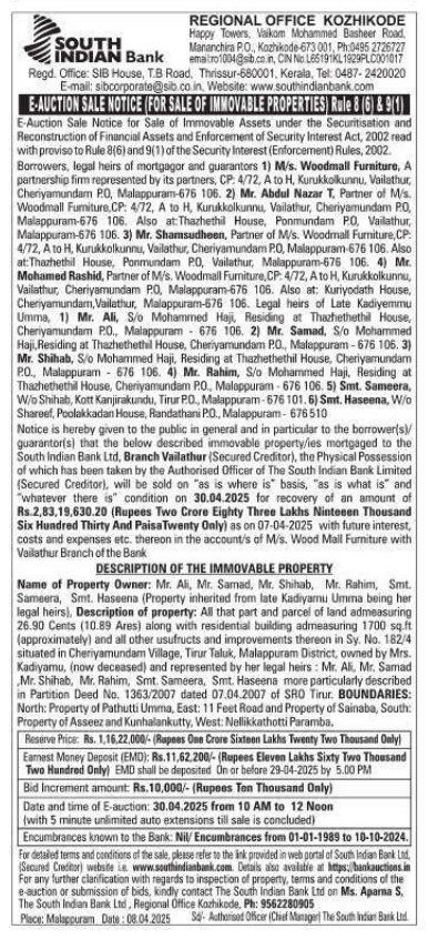 | Schedule of Property: | Name of Property Owner: Mr. Ali, Mr. Samad, Mr. Shihab, Mr. Rahim, Smt.Name of Property Owner: Mr. Ali, Mr. Samad, Mr. Shihab, Mr. Rahim, Smt. legal heirs), Description of property: All that part and parcel of land admeasuring 26.90 Cents (10.89 Ares) along with residential building admeasuring 1700 sq.ft (approximately) and all other usufructs and improvements thereon in Sy. No. 182/4 situated in Cheriyamundam Village, Tirur Taluk, Malappuram District, owned by Mrs.Kadiyamu, (now deceased) and represented by her legal heirs Mr. All Mr. Samad Mr. Shihab, Mr. Rahim, Smt. Sameera, Smt. Haseena more particularly described in Partition Deed No. 1363/2007 dated 07.04.2007 of SRO Tirur. BOUNDARIES: North: Property of Pathutti Umma, East: 11 Feet Road and Property of Sainaba, South: Property of Asseez and Kunhalankutty, West Nellikkathotti Paramba. |