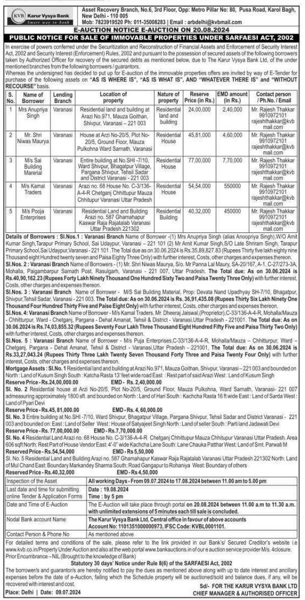 | Contact Details: | Contact Authorized Officer : Mr. Rajesh Thakkar, Mob. No.:9910972101, Email: rajeshthakkar@kvbmail.com |