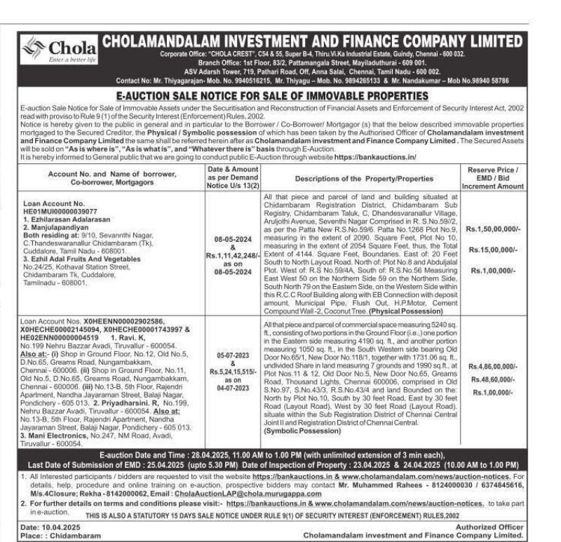 | End Date and Time of Auction: | 28-04-2025 1:00 pm |