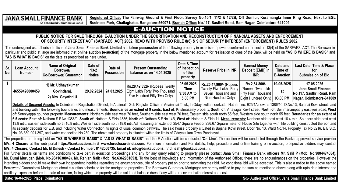 | Contact Details: | Contact The Authorized Officer : Mr. Salil P 9884474084 Mr. Durai Murugan 9841638849 Mr. Ranjan Naik 6362951653 |