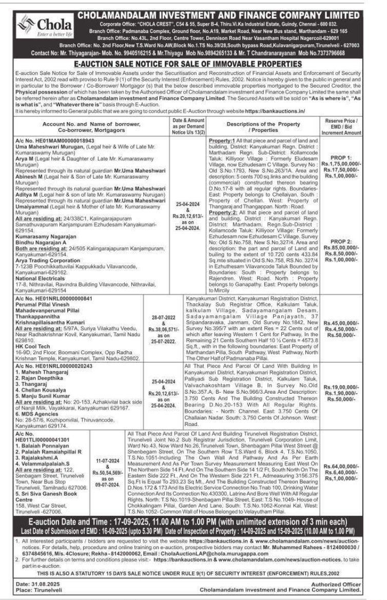 | Contact Details: | Contact The Authorized Officer : Mr Thiyagarajan - 9940516215, Mr Thiyagu - 9894265133, Mr T Chandranarayanan - 7373796668, Mr. Muhammed Rahees - 8124000030, 6374845616 |