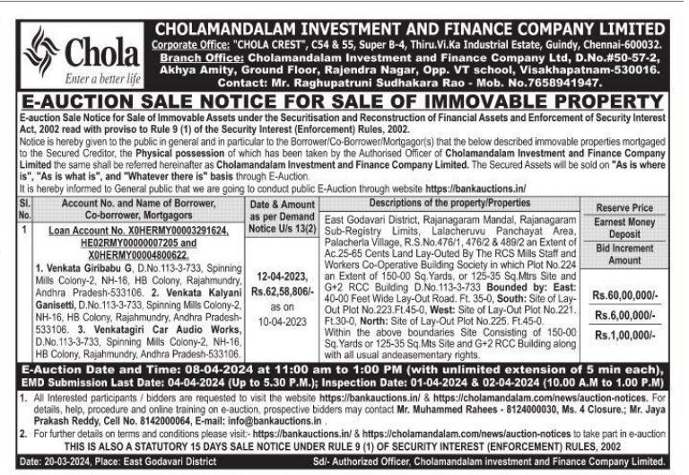 | Contact Details: | Contact The Authorized Officer : Mr. Raghupatruni Sudhakara Rao - Mob. No.7658941947. Mr. Muhammed Rahees Mob. No. 8124000030 |