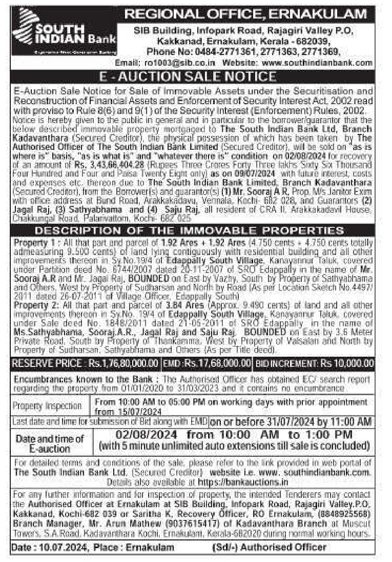 | Contact Details: | Contact The Authorized Officer Phno : 8848925568, Mr Arun Mathew : 9037615417/ 0484-2771361/ 2771363/ 2771369 |