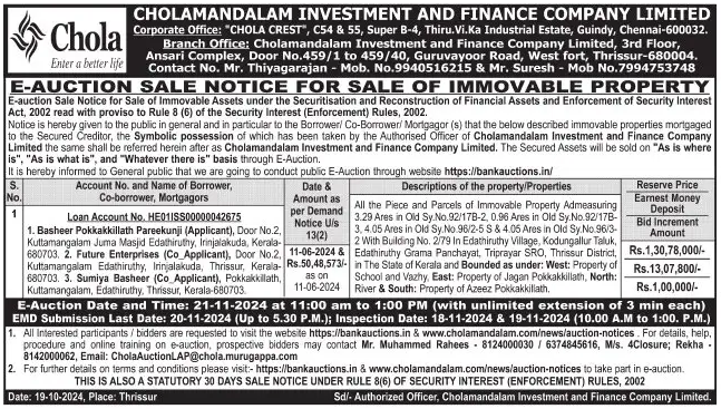 | Schedule of Property: | All the Piece and Parcels of Immovable Property Admeasuring 3.29 Ares in Old 92/17B-2 0.96 Ares in Old Sy.No.92/17B-3.4.05 Ares in Old Sy No 96/2-5 S & 4.05 Ares in Old Sy.No.96/3-2 With Building No. 2/79 In Edathiruthy Village Kodungallur Taluk, Edathiruthy Grama Panchayat, Triprayar SRO, Thrissur District, in The State of Kerala and Bounded as under: West: Property of School and Vazhy, East: Property of Jagan Pokkakkillath, North: River & South: Property of Azeez Pokkakkillath. |