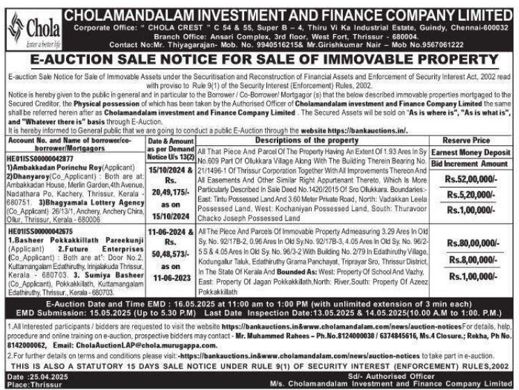 | Contact Details: | Contact the Authorized Officer : Mr. Thiyagarajan- Mob. No. 9940516215, Mr.Girishkumar Nair - Mob No.9567061222 |