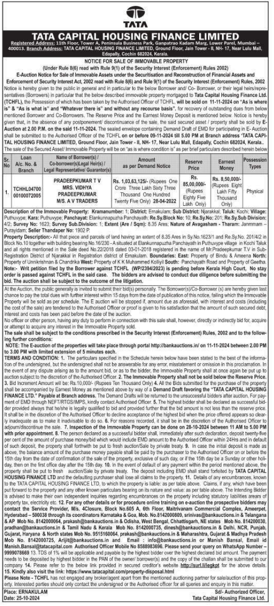 | Schedule of Property: | All that piece and parcels of land having an extent of 8.35 Ares in Sy.No.1623/1 and Re.Sy.No. 201/4/2 in Block No. 10 together with building bearing No.16/230-Asituated at Elankunnapuzha Panchayath in Puthuvype village in Kochi Taluk and all rights mentioned in the Sale deed No.22/2018 dated 03-01-2018 registered in the name of Mr.Pradeepkumar T.V in Sub- Registration District of Njarakkal in Registration district of Ernakulam. Boundaries: East: Property of Bindu & Ameena North: Property of Unnikrishnan & Chandrika West: Property of KK Muhammed Kolliyil South: Panchayath Road and Property of Geetha. Note: Writ petition filed by the Borrower against TCHFL (WP/2394/2023) is pending before Kerala High Court, No stay order is passed against TCHFL in the said case. The bidders are advised to conduct due diligence before submitting the bid. The auction shall be subject to the outcome of the litigation. |