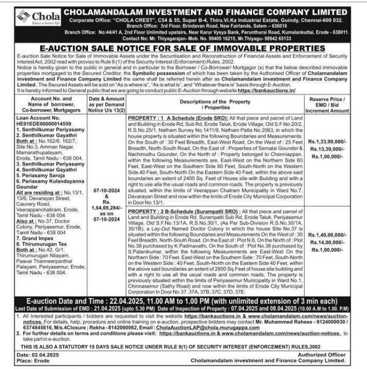 | Contact Details: | Contact The Authorized Officer: Mr. Thiyagarajan - 99405 16215, Mr. Thiyagu - 98942 65133, Mr.Muhammed Rahees - 8124000030 / 6374845616 |