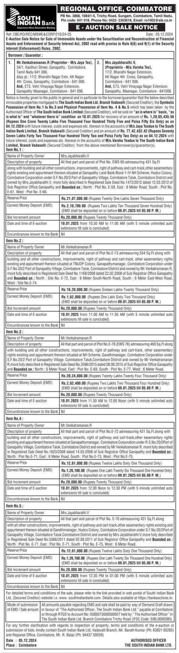 | Contact Details: | Contact The Authorized Officer : Mr Barath Kumar 6382165265/ Mr. R Balaji : 9443759259/ 0422-2303618 |