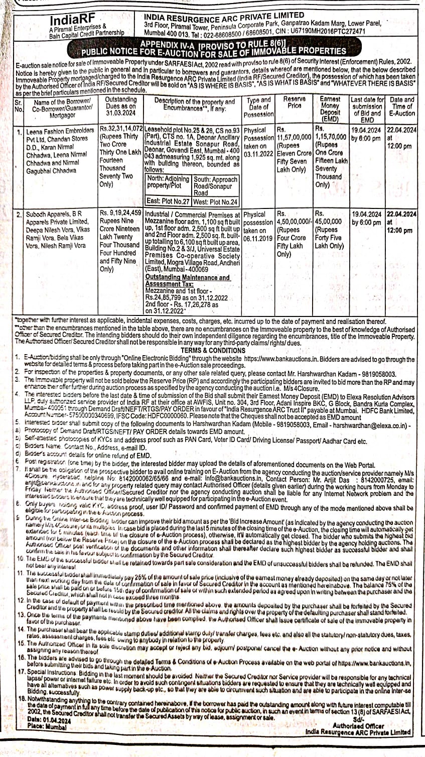 | Contact Details: | Contact The Authorized Officer: 022-68608500 68608501, Harshwardhan Kadam - 9819058003, Email - harshwardhan@elexa.co.in |