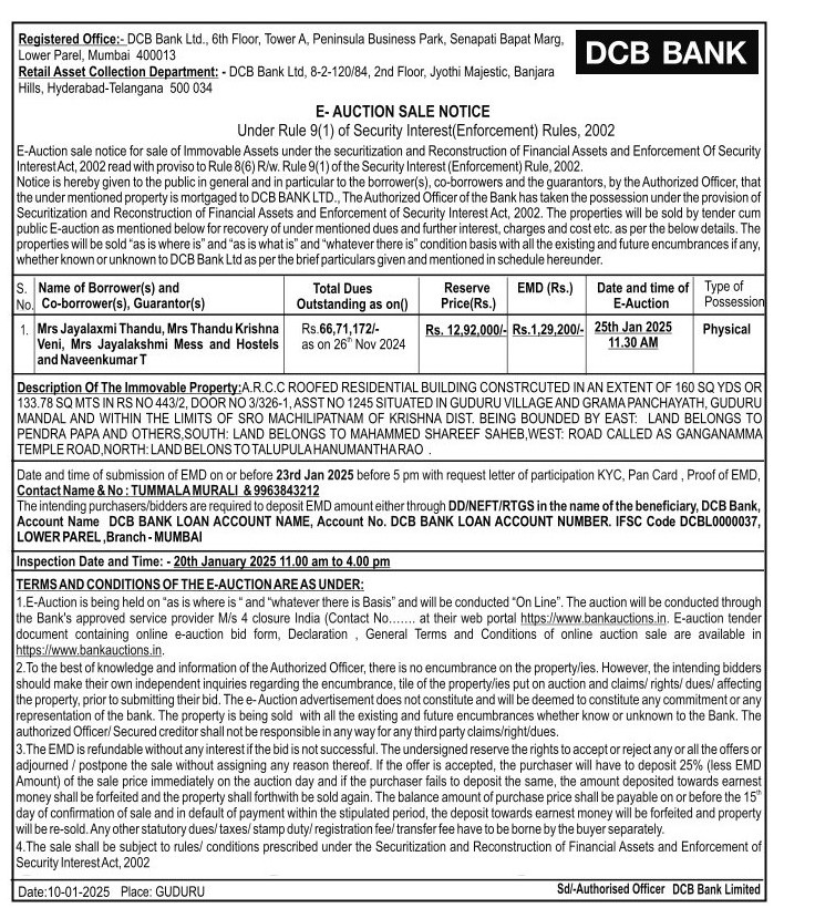 | End Date and Time of Auction: | 25-01-2025 12:30 pm |