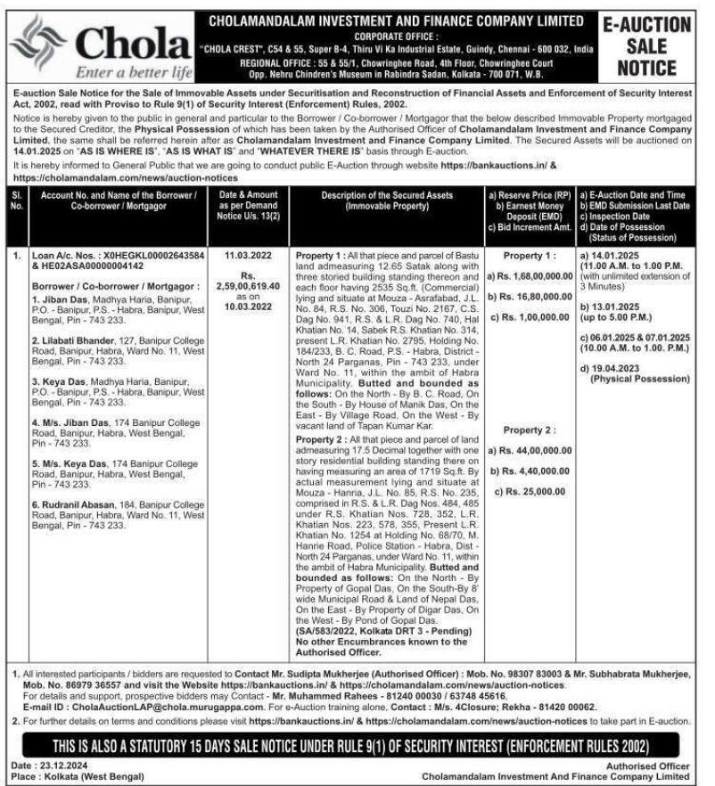 | Contact Details: | Contact The Authorized Officer : Mr Sudipta Mukherjee 9830783003, Mr. Subhabrata Mukherjee 8697936557, Mr. Muhammed Rahees 81240 63748 45616 |