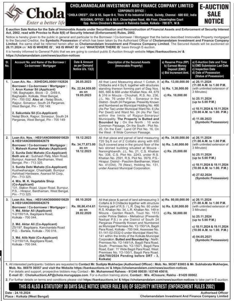 | Contact Details: | Contact The Authorized Officer: Mr. Sudipta Mukherjee 9830783003 & Mr. Subhabrata Mukherjee 8697936557, Mr. Muhammed Rahees - Ph.No.8124000030 |