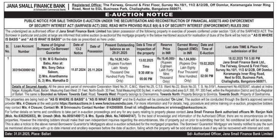 | Contact Details: | Contact the Authorized Officer : Mr. Ranjan Naik (Mob. No.6362951653), Mr. Umesh (Mob. No.8050149617) & Mrs. Syeda (Mob. No.7400445147). |