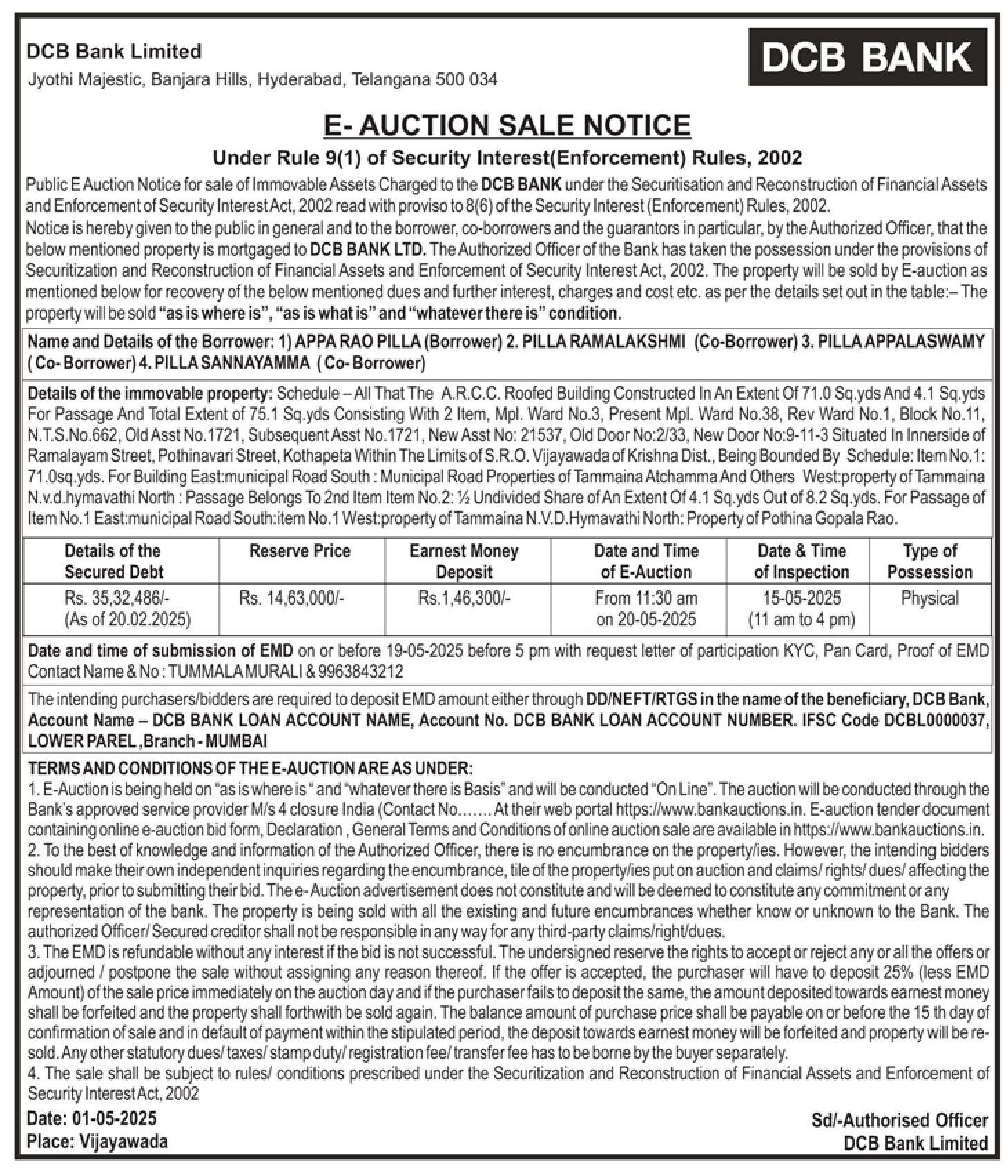 | Contact Details: | Contact The Authorized Officer : TUMMALA MURALI - 9963843212 |