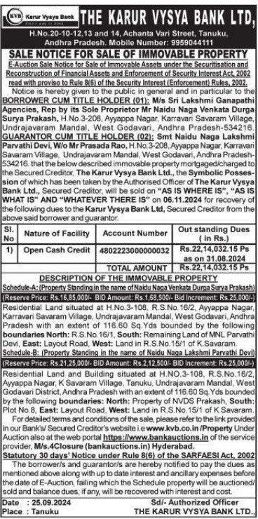 | Schedule of Property: | Residential Land and Building situated at H.NO.3-108 R.S.No.16/2 Ayyappa Nagar, K Savaram Village, Tanuku, Undrajavaram Mandal, West Godavari District Andhra Pradesh with an extent of 116.60 Sq. Yds bounded by the following boundaries: North: Property of NVDS Prakash South: Plot No. 8. East: Layout Road, West: Land in R.S. No. 15/1 of K Savaram. |