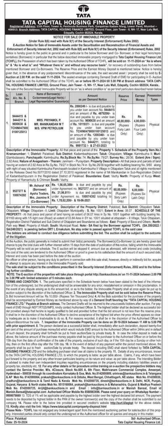 | Schedule of Property: | Description of the Immovable Property: All that piece and parcel of the Property 1. Schedule of the Property Item. No.1 Kramanumber: 1: District: Palakkad; Sub District: Kadambazhipuram: Taluk: Ottapalam: Village: Karimbuzha II: Muri: Elambulassery Panchayath: Karimbuzha; Re.Sy.Block No: 74: No: 79/27: Survey No.: 26/36; Extent (Are / Sqm): 2.92Ares: Nature of Avagasham Tharam: Janmam Purayidam Property Description:- All that piece and parcels of land having an extent of 2.92 Ares in Re.Sy.No. 79/27 in Block No.74 in Sy 26/36 together with building bearing No. 9/60 along having an extent of 2.92 Ares in Re.Sy.No. 79/27 in Block No.74 in Sy 26/36 together with building bearing No. 9/60 along with right of way situated Karimbuzha Panchayath located in Karimbuzha II Village in Ottapalam Taluk and all rights mentioned in the Release Deed No 5077/2010 dated 27.10.2010 registered in the name of Mr Manikandan in Sub-Registration District of Kadambazhipuram in the Registration District of Palakkad Boundaries: East: Vazhy North: Property of Kunju West: Property of Ramankutty & Chinnan South: Vazhy. |