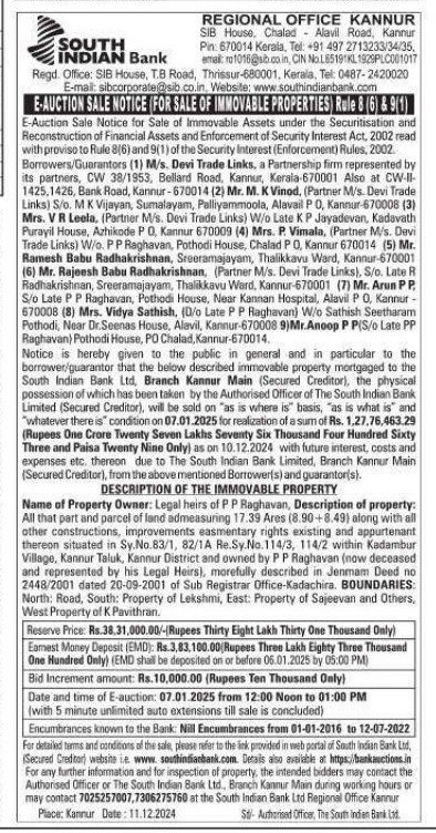 | Schedule of Property: | Name of Property Owner: Legal heirs of PP Raghavan, Description of property: All that part and parcel of land admeasuring 17.39 Ares 8.90+8.49 along with all other constructions, improvements easmentary rights existing and appurtenant thereon situated in Sy.No.83/1, 82/1A Re.Sy.No.114/3, 114/2 within Kadambur Village, Kannur Taluk, Kannur District and owned by PP Raghavan (now deceased and represented by his Legal Heirs), morefully described in Jenmam Deed no 2448/2001 dated 20-09-2001 of Sub Registrar Office-Kadachira BOUNDARIES: North: Road, South: Property of Lekshmi, East: Property of Sajeevan and Others, West Property of K Pavithran. |